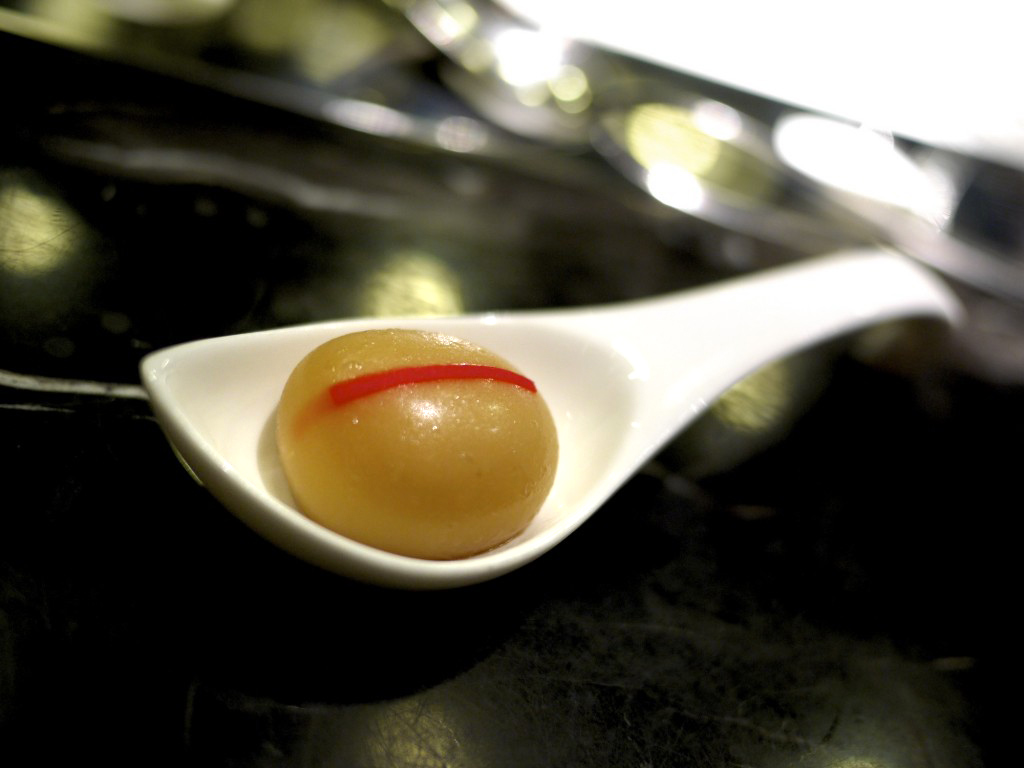 Image 11: I had heard many people talk about Chef Leung’s signature dish of Molecular “xiao long bao”. I tasted some of the finest xiao long bao’s during my ten day trip to China so I was curious to see whether Leung had compromised the dish for the sake of style. I was advised to eat this in one bite as it would literally fall apart after the first bite. Sure enough, there was an explosion in my mouth! It was bizarre to have the flavour of xiao long bao with no texture at all but it was sticky and delicious with a long and rich aftertaste in my mouth.