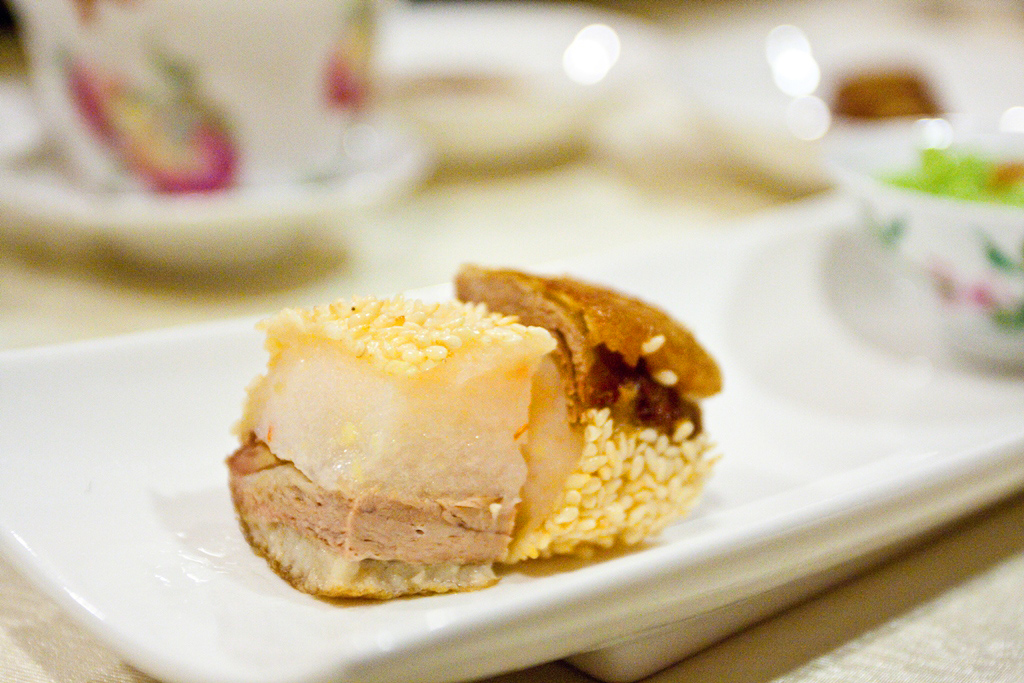 Image 4: With no time wasted, the food was served. Our first bite after the long haul was a deep fried duck with shrimp paste and sesame. The combination was remarkable - crispy on the top followed by a warm paste and the soft duck meat. The paste had a distinct spongy texture resembling fat, but Ivan immediately pointed out that no fat was used . This first item set a very high standard for our China trip!