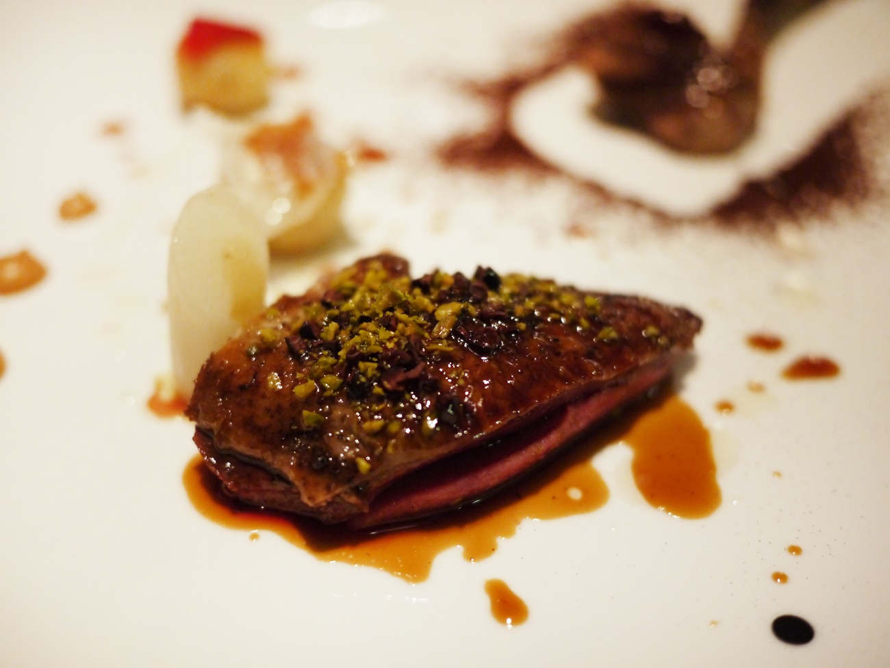 Image 13: Then came the main dish – pigeon cooked in cocoa shell! This was nicely cooked with a pink centre and a pistachio encrusted skin, though the layer of fat underneath was a little too thick for my liking.