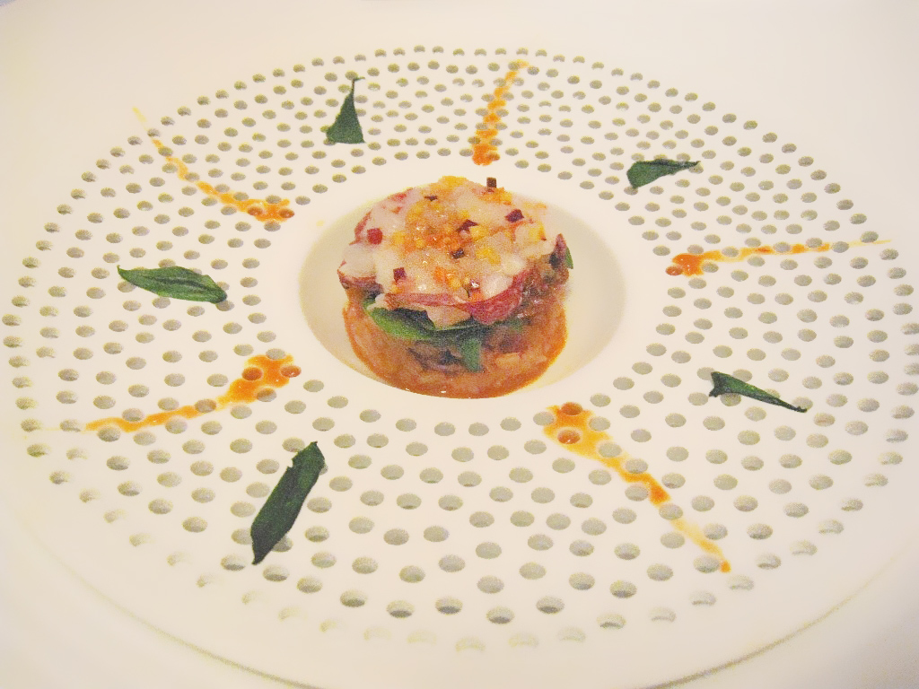 Image 17: Blue lobster "raw-cooked in cold steam" - in other words, lobster tartar in lobster vinaigrette, resting on a crisp coral pancake. OK, so the dry ice steam was a bit gimmicky - but the crispy caramel offered a nice touch of sweetness to the vinaigrette and undoubtedly added another dimension to the texture. Excellent course!