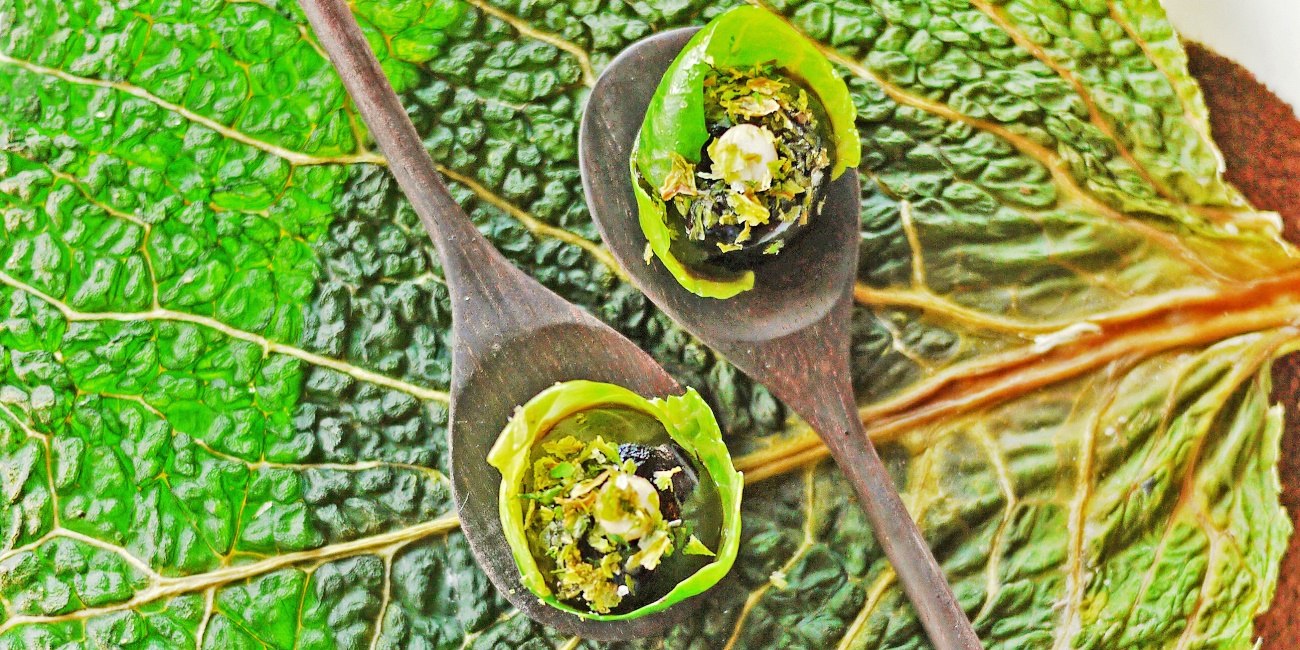 Image 8: Great idea, this – using a large piece of flattened, dried cabbage leaf as serveware. Very dramatic! On top was a pair of wooden spoons…