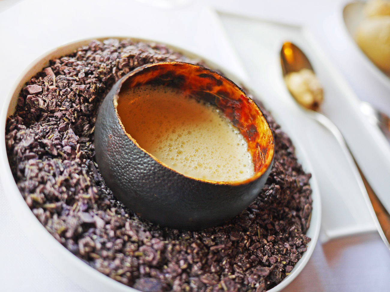 Image 19: … the warm sea urchin velouté served in a bowl made from the burnt shell of a dehydrated Grapefruit! And what an interesting experience! The bitterness of the frozen grapefruit somehow resonated with both the richness of the warm Spanish sea urchins and the slightly metallic overtones produced – I imagine – by their iodine content. The whole thing was complemented beautifully by a delicate ‘burnt’ aroma. This must be the most memorable course of our trip so far! Unusual, for sure - but fun!