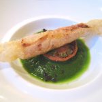 Image 17: A very aromatic turbo dish with an intense fragrance of raw greens composed of green pea purée, pea crouton, pea merigue, baby beansprout, and pea foam! The lovely smell resembling grass gave us a sense of the spring! An excellent course!