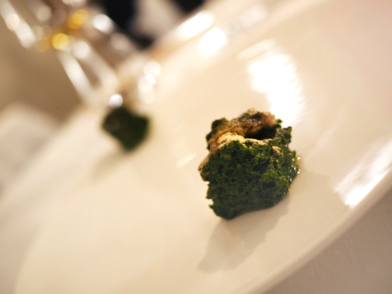 Image 19: Glad to see something slightly more substantial as it was already past nine and still no bread was served! Crunchy snail, refreshing apple sorbet, bitter fennel, and very bitter matcha dusts. Again, no seasoning at all, just flavours from the ingredients. Don't know, I guess I did like it except for the strong bitter aftertaste from the fennel and matcha. Hmmm, I never experienced a meal like this before!