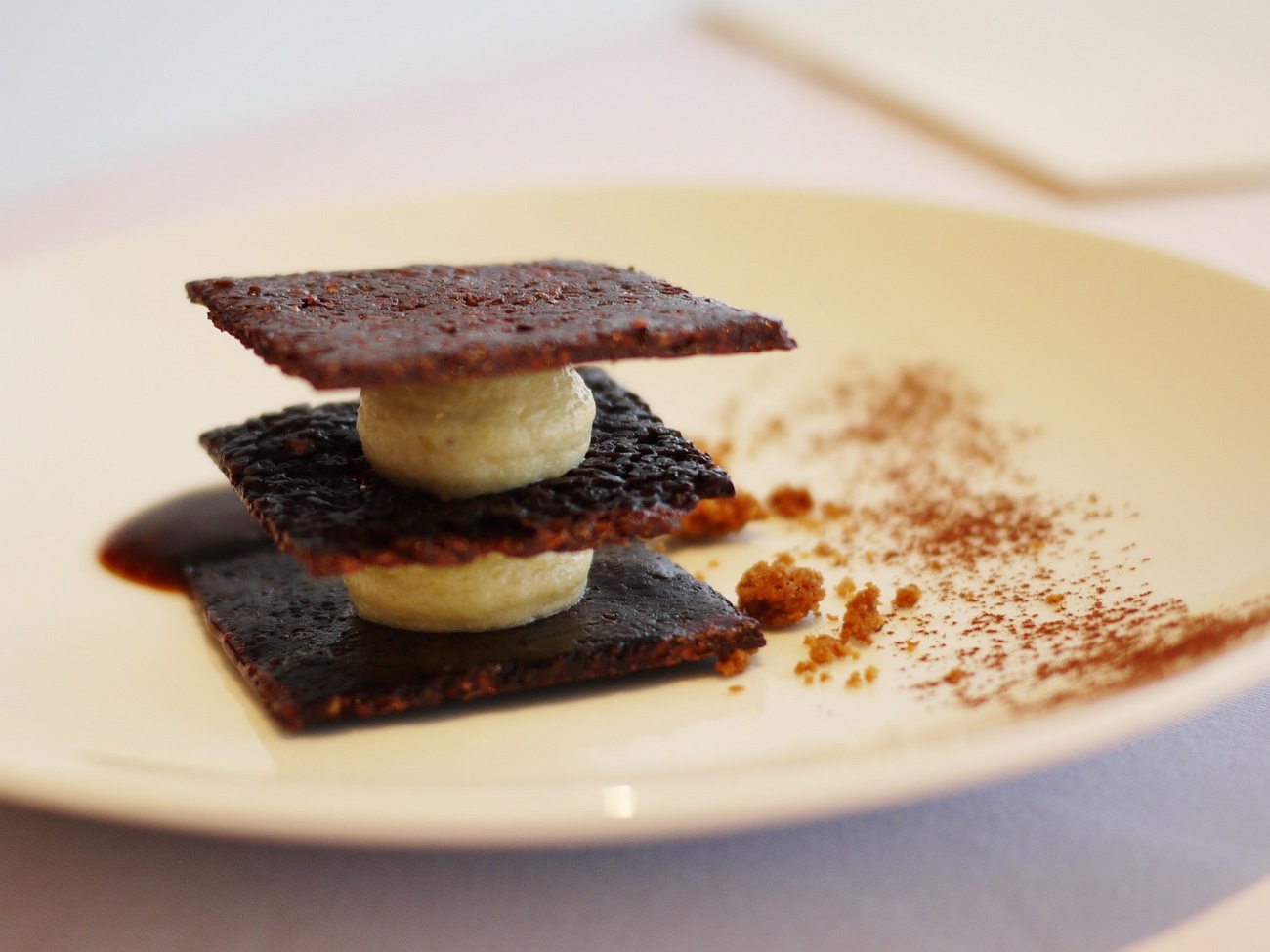 Image 41: The second dessert was cacao nougatine and ginger cream sandwiched in between a stack of three spiced biscuit squares. The best way to have this was to soak it with the coffee sauce on the plate to create an interesting coffee-ginger interplay. Amazing!