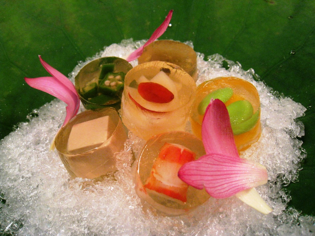 This stunning piece of artwork resting on a big lotus leaf composed of six types of jelly: prawn, lily bulb, okra (often known as gumbo or ladyfinger), wakame seaweed with herring roe, egg custard, and foie gras. What a colourful masterpiece!