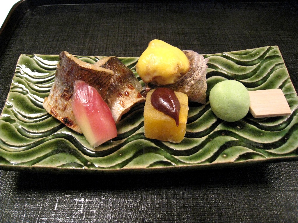 Image 17: Barracuda flavored with yuzu citron, horned turban (turbo), a cheese ball covered with mashed green soy beans, and a cube of deep fried persimmon topped with sesame miso paste.