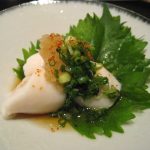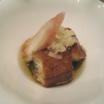 Image 7: Just a delicate appetizer before the eel. Sea bream liver with daikon and ponzu (citrus based sauce). We fell in love with these subtle but elegant Japanese flavours.