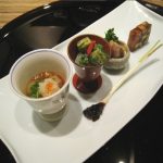 Image 9: Starting from the bottom, a smoky barbeque eel jelly with an intense smokiness followed by a tiny cup containing a crunchy baby squid in a mild mustard sauce.