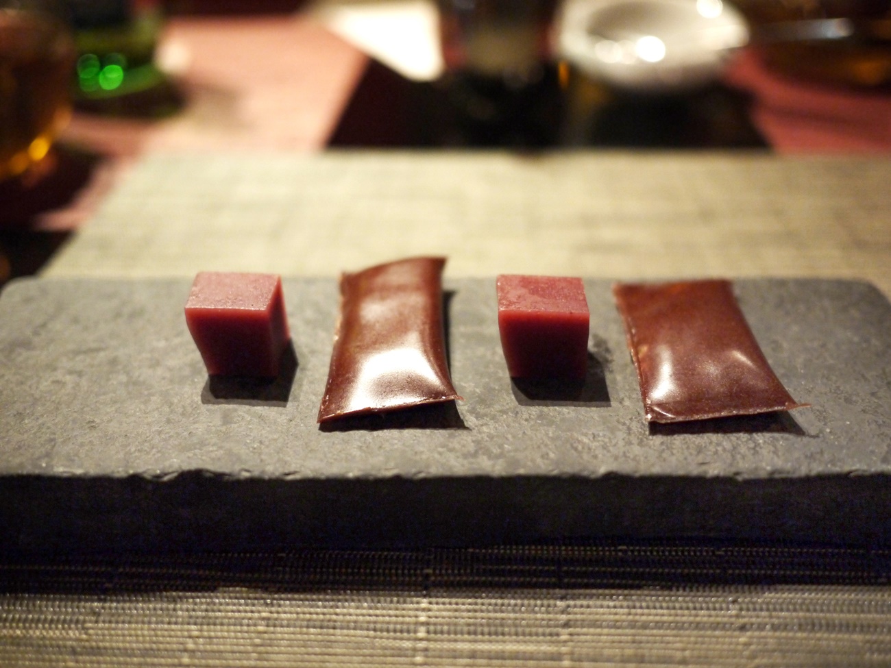 Petits fours: Beetroot and fennel, chocolate leather bag with sesame