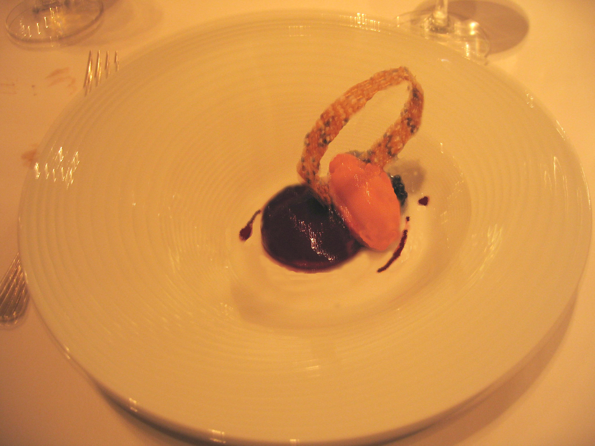 Our final dessert, poached pear with mango sorbet. It was a high quality meal. We were very satisfied with every course of the menu!