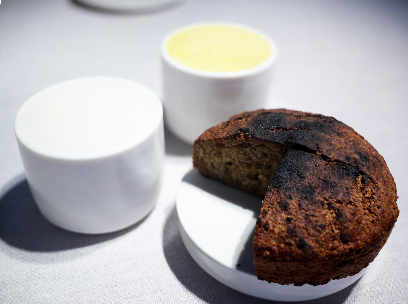 Image 30: Warm bread from the oven, slightly burnt. It had been made with four types of grain, and had a texture more like muffin. It came with goat and cow butter.