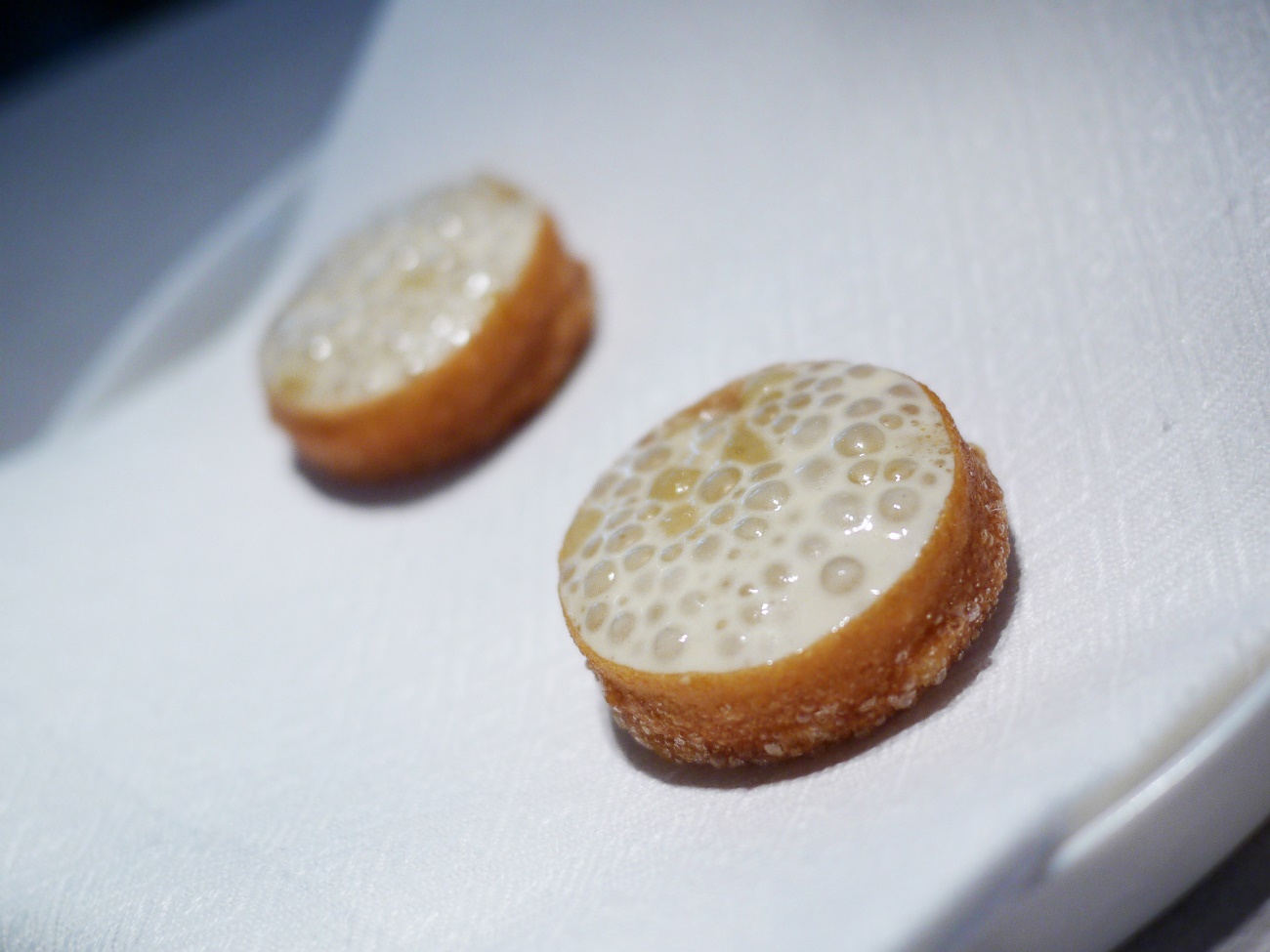 Image 25: At least we couldn’t complain that there was insufficient amuse bouche – they continued to come, one after the other. Finally, something with a more powerful flavour arrived - yeast pancake with pork belly cooked in vinegar. On top was cream of plums, plus a slice of fresh radish. The next to arrive was…
