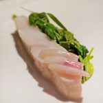 Image 28: Now the first course. And it was a very interesting dish. Raw asparagus had been skinned, chopped into tiny sticks, and placed on flakes of mackerel with gooseberry jelly. It had then been finished with a broth made from burnt asparagus skin and barley. I’d never had asparagus raw before, and I was surprised at its texture, which was soft-crunchy, rather like apple. The smell is very similar to leek. I couldn’t believe how different asparagus is after being cooked, but you live and learn! The mackerel was pleasant.