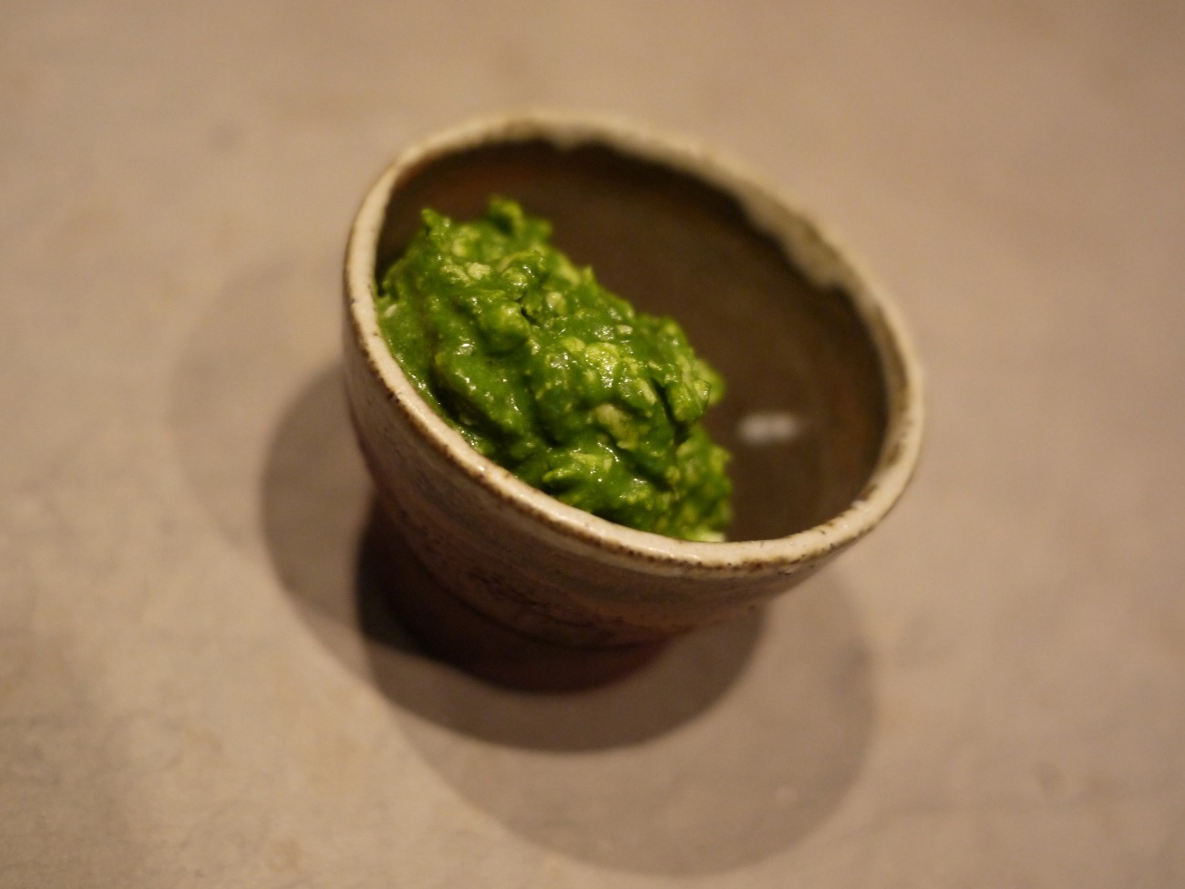 Image 7: Raw langoustine from the Faroe Islands with emulsion of the brain & liver with pine oil. Mexican sour gherkin & dill
