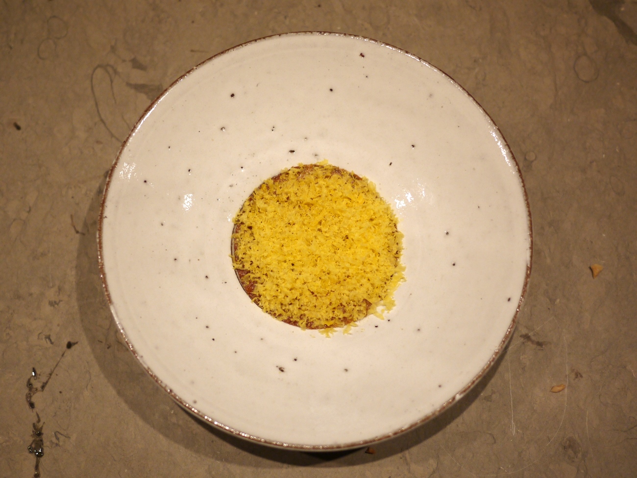 Image 38: Blood orange rolled in lingonberry sugar / Fermented garlic fudge / Pumpkin & truffle paper