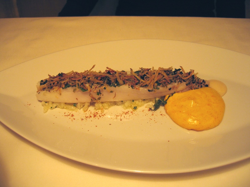 LEMON SOLE - "fish & chips" with curry aroma. It was a sole with cauliflower purée underneath and coated with crispy potato and seaweed on top.