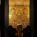 Image 30: At the entrance is a lounge area with copies of Mathias' cookbook. Behind the golden screen, on the right is Matbaren, the Food Bar; on the left is Matsalen, the Dining Room.