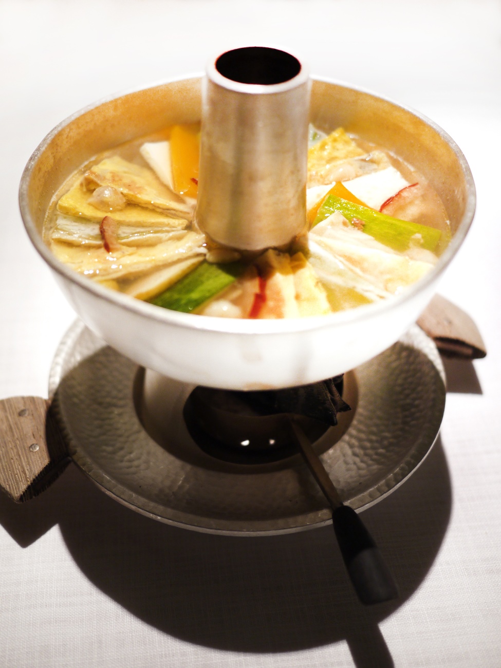 Judging by older online reviews of this restaurant, its menu used to be a poor fusion of European and Korean cuisines. However, things seem to have changed significantly – these days, I’d describe it as much more like traditional Korean cooking, slightly tuned to meet contemporary tastes. It seemed obvious to me that the place has improved a lot over the last few years, a change no doubt triggered by Michelin 3-star award. And it’s fair to say that every dish was carefully plated to 3-star standard, even though not every dish delivered to 3-starexpectations in terms of taste. In fact, some of the starters were quite bland, particularly the Nine delicacies, which is traditionally a royal court dish. It was, it’s true, a very colourful and attractive-looking dish, but it tasted of. . . well, nothing, really; it was just a wrap of some finely julienned vegetables and mushrooms. Quite how they arrived at its name, I’ve no idea, as I couldn’t detect a single delicacy, let alone nine! And the Royal Hot Pot had a similarly misleading name. Consisting of a small pot of beef broth, topped with neatly arranged slices of fish, beef, and vegetable, it – again – tasted of nothing much. I wouldn’t have liked to be in the shoes of any chef who served such a dish to the Emperor, back in the days of the ancient kingdoms!