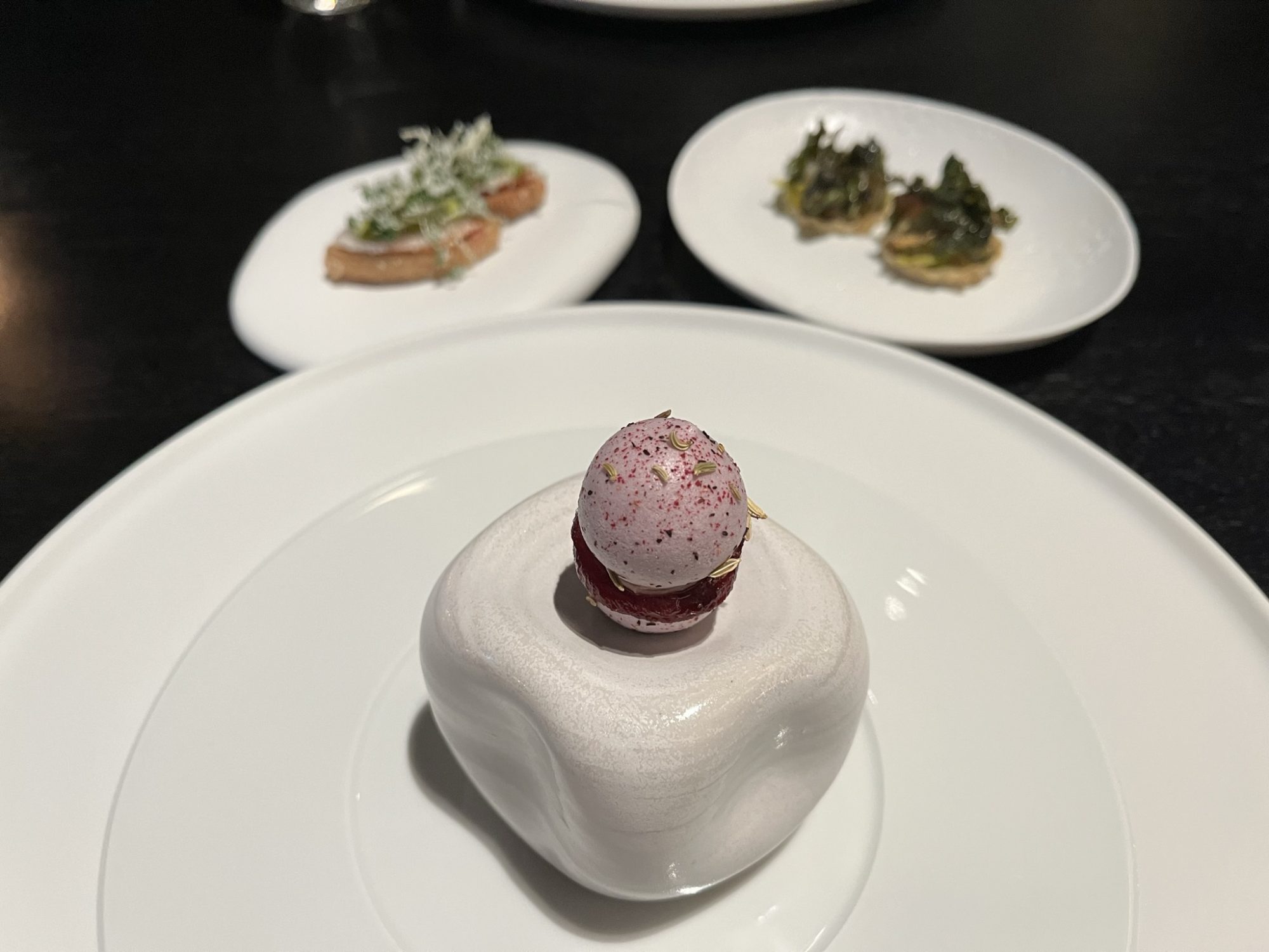The finale of the meal was a visually appealing set of petits fours: cannelés, raspberry macarons, citrus caramel tartlets, chocolate truffles and cute “magic mushrooms” (white chocolate in the shape of a mushroom). Needless to say, similar to the amuse bouche, every item here was beautifully handcrafted.
