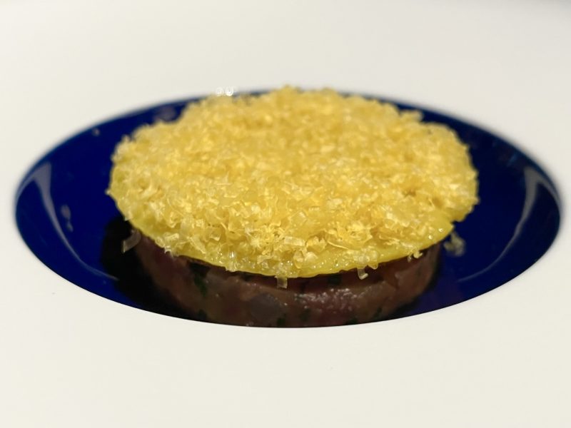With many outstanding dishes already coming out from this kitchen, I knew Marleen–responsible for the pastry – wouldn’t end the meal with a simple dessert. Lo and behold, presented next was a bergamot banana foam, which was crystallised by a dip into liquid nitrogen at -196°C. This was served on a disk of aerated chocolate, with a sweet yolk sauce created by curing the yolk in caramel. A sophisticated dessert to say the least. You can imagine the complex combination of textures when putting all these components into the mouth. Incredible!