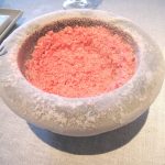 Image 29: Let's continue with our fourth course. This vegetable with concentric purple circles is called Chioggia beet, marinated in saffron along with slices of rat-tail radish. Chef Reitbauer has a farm where he sources most of his ingredients. He definitely grows some unusual stuff there.