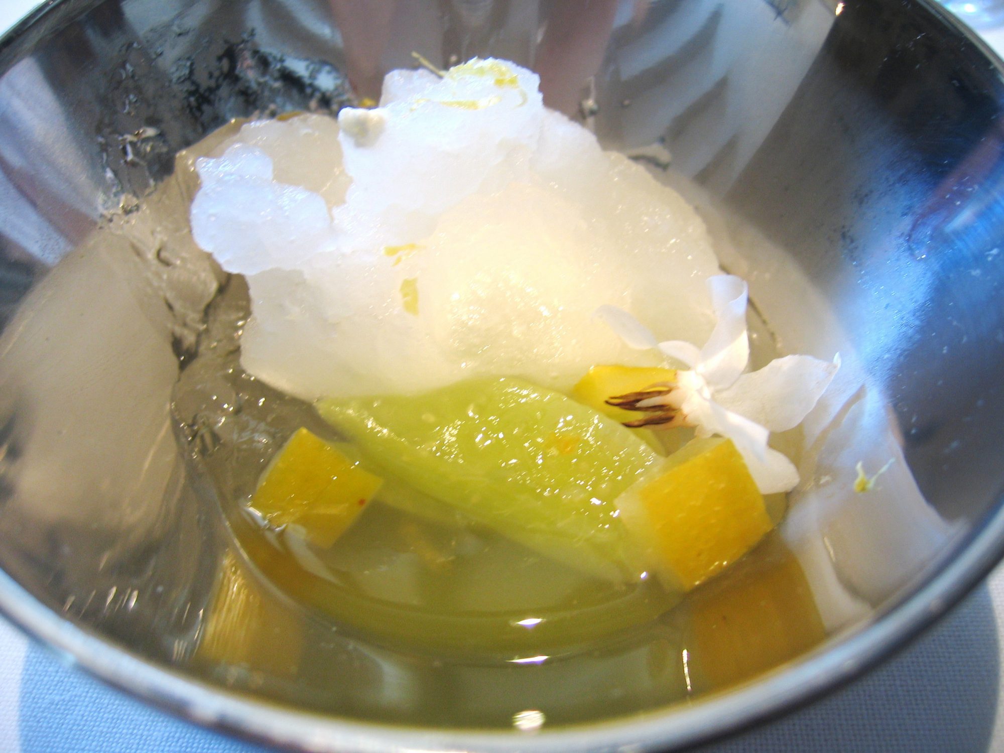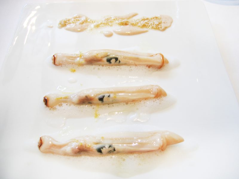 Our next course was from our special e-mail request. This famous dish is probably the most photographed El Bulli dish and is the front cover of the El Bulli catalogue 2004. This dish came with a caviar spoon and was presented in an El Bulli tin which mimics an Iranian caviar blue tin. It was filled with melon balls, looking just like caviar. Biting into those melon balls was just like biting into caviar, only to have melon juice burst into your mouth. It was garnished with passion fruit seeds, bringing a hint of acidity to the sweet melon. This was definitely one of the chef’s masterpieces, perfect in every possible way!