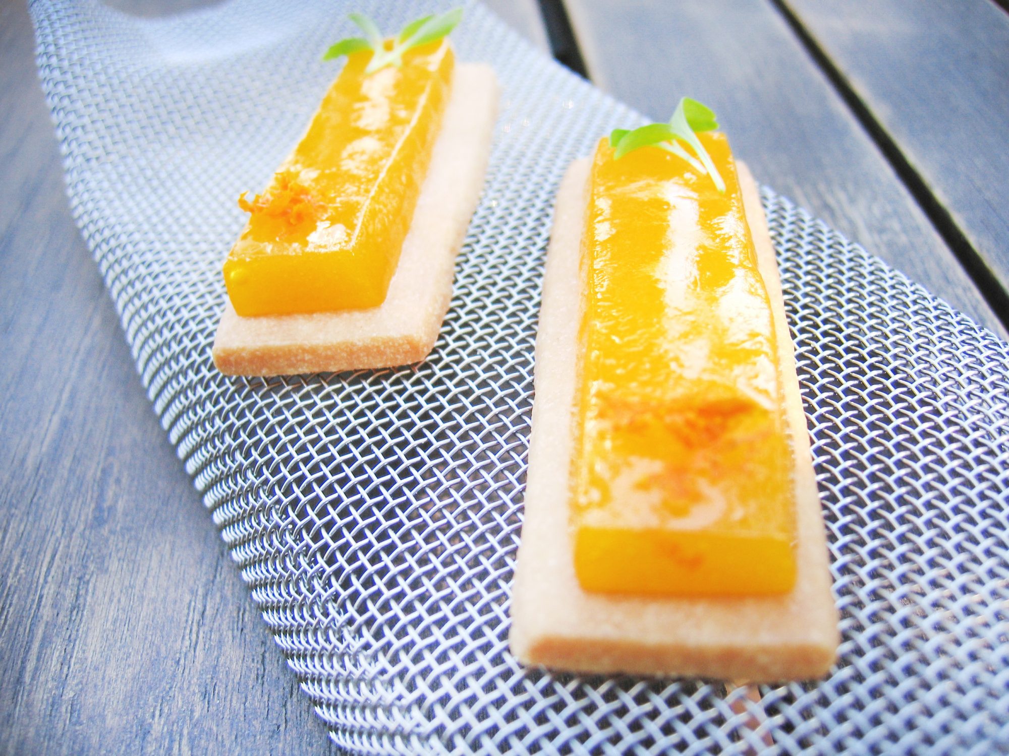 Our tenth course was an icy tangerine cube and a cookie. The peanut and curry cookie had a strong taste; luckily the tangerine juice inside the icy cube was very fruity, diluting away the after taste of the cookie.