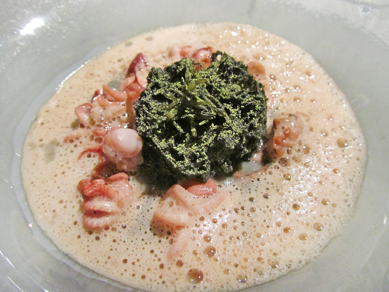 Image 39: An “onion rock” surrounded by baby octopus. The rock was seaweed cake with a subtle sweetness. The crunchy octopus and the spongy cake with a deep taste of seaweed - We like this course a lot!