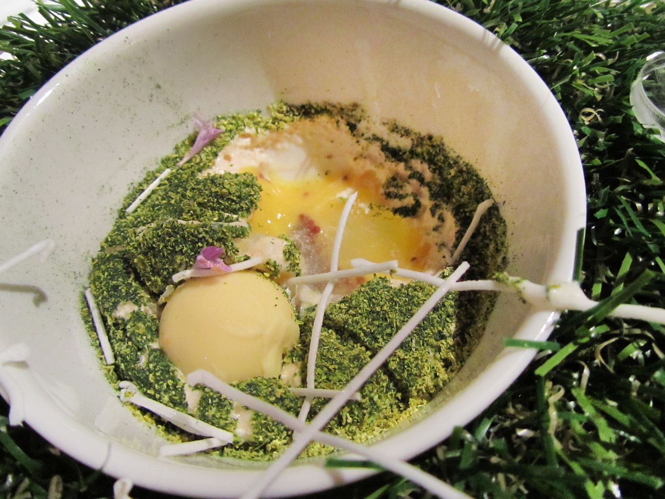 Image 43: We were instructed to start with the chives at the bottom, then move upward to spiced tomato, the smoked paprika, and to finish with Sichuan pepper! A sophisticated course!