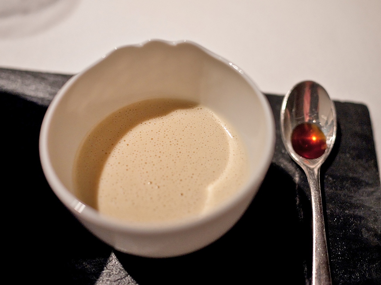 Image 27: A rich creamy oyster velouté in the middle followed by a drop of sherry reduction on the spoon just to finish our palate with a touch of sweet grape! Even though we were only one course into it, we already knew we would like this place a lot!