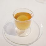 Image 33: And now, one of the most simple-looking but most sensational, dishes of all time - Hot & Iced Tea! I had this last time, but I’m still fascinated by it. It’s tea at two different temperatures, served in a single cup – on the left side it was very cold and on the right it was warm. At the very last moment, the waiter removed a film in the middle and suggested that we drink it immediately. The resulting temperature contrast delivers an almost numbing sensation on the tongue, as if the brain is confused which side of the tongue it should believe in! A truly stimulating course!