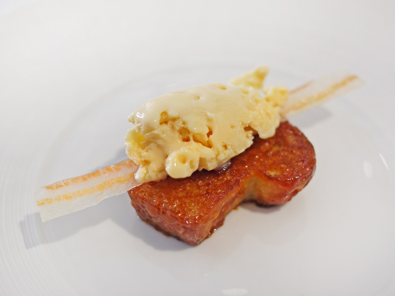 Image 46: This is the "Not-so-full English Breakfast"! It’s scrambled egg and bacon ice cream, with ultra-thin bacon served on toast. It's actually a dessert, but it has the flavour profile of a breakfast! And note that the bacon must be about a molecule thick (slight exaggeration, but not much!) because it's translucent! Incredible!
