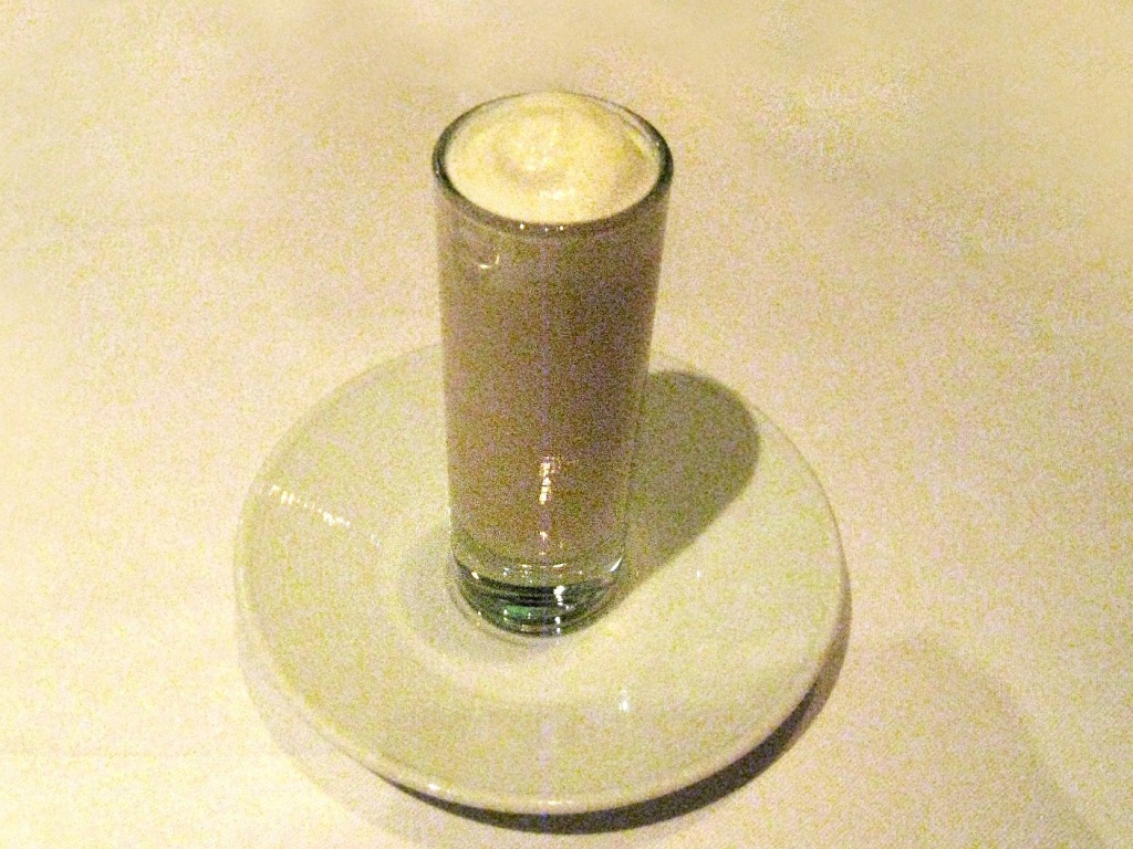 Image 6: One last amuse bouche, a tall shot glass of onion and white bean velouté with nutmeg. It had a dominating onion flavour but not overwhelming. A brilliant selection of pre-meal snacks to seduce our palate!